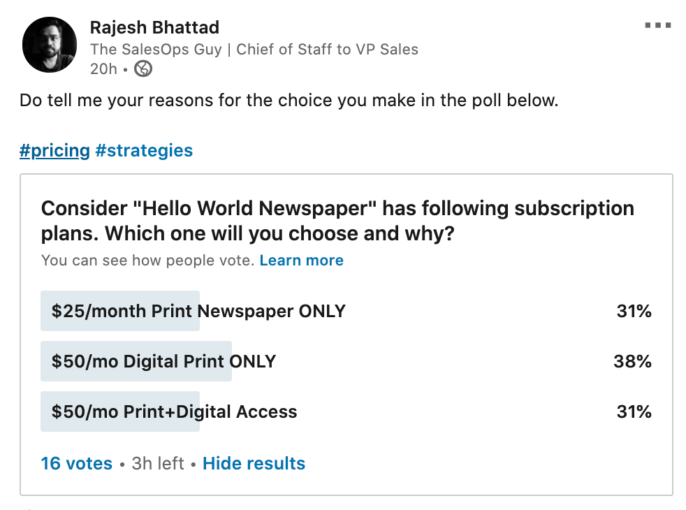 Add to the Center Stage Effect, the narrative on how you position the product plays a key role. In my poll notice I add “ONLY” to the first two subscription plans thus placing in my viewers minds two real choices of the same nature. The third subscription does not fall into a pattern and hence your brain looks at it as an outlier.