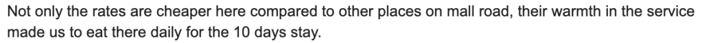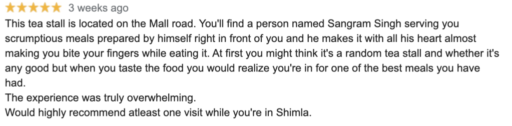 In Shimla after a day of activities in the mountain (especially that scary horse-riding down the mountain!), we were strolling the local market hungry and on the lookout for a good dining place. Two restaurants stood out – both small – both adjacent and both having the same set-up as was the case with all local restaurants. But for some reason one restaurant had all seats filled and the other one had free seats available.