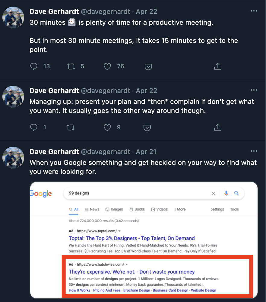 Or their quick takes on meetings or quick advice on managing up. LinkedIn is for long form content. Twitter for quick takes. And we all have too many quick takes.