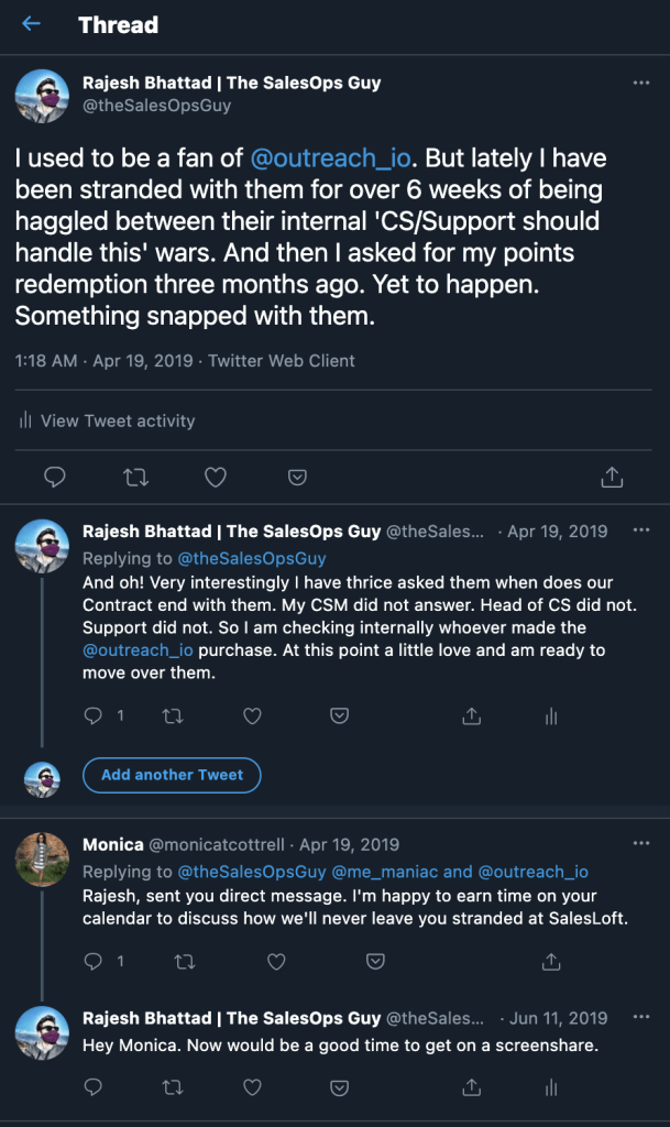 Here’s an example of my own venting out on a bad experience I was having with Outreach, one of the B2B SaaS providers back in 2019. Take a look at the images below. Note that within moments a sales rep from SalesLoft, a competitor to Outreach, reaches out to me. And coz I was angry with Outreach, what do you think happened? I of course said “Yes! I wanna see your demo now!”.