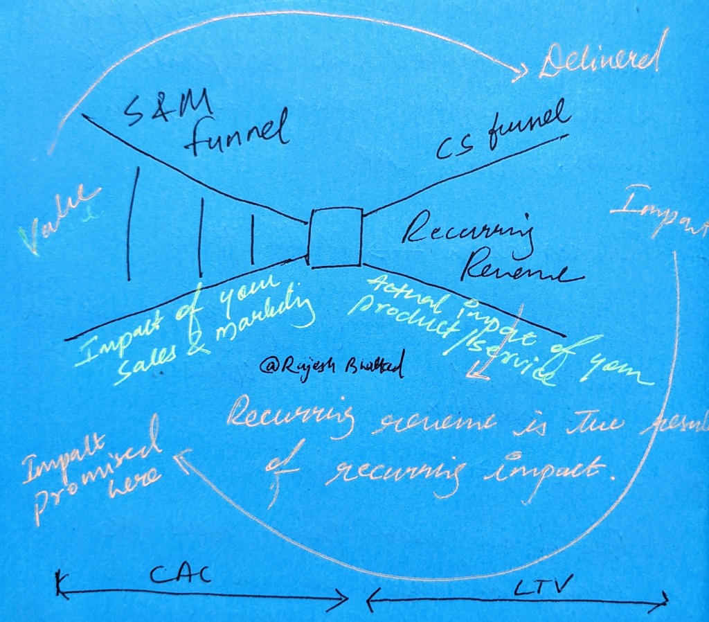 It is then imperative that the value that was promised in the Sales & Marketing Funnel (S&M) be delivered as impact in the Customer Success funnel (CS) for you to make “recurring revenue” off the same customer with no additional cost beyond the first sale.